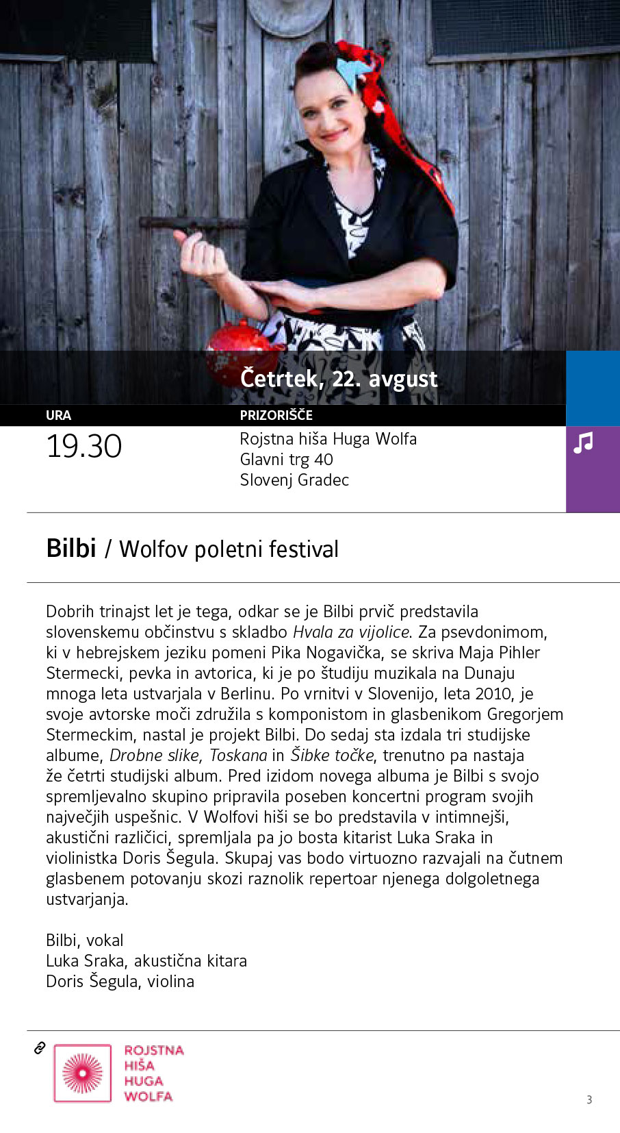 Dobrih trinajst let je tega, odkar se je Bilbi prvič predstavila slovenskemu občinstvu s skladbo Hvala za vijolice. Za psevdonimom, ki v hebrejskem jeziku pomeni Pika Nogavička, se skriva Maja Pihler Stermecki, pevka in avtorica, ki je po študiju muzikala na Dunaju mnoga leta ustvarjala v Berlinu. Po vrnitvi v Slovenijo, leta 2010, je svoje avtorske moči združila s komponistom in glasbenikom Gregorjem Stermeckim, nastal je projekt Bilbi. Do sedaj sta izdala tri studijske albume, Drobne slikeToskana in Šibke točke, trenutno pa nastaja že četrti studijski album. Pred izidom novega albuma je Bilbi s svojo spremljevalno skupino pripravila poseben koncertni program svojih največjih uspešnic. V Wolfovi hiši se bo predstavila v intimnejši, akustični različici, spremljala pa jo bosta kitarist Luka Sraka in violinistka Doris Šegula. Skupaj vas bodo virtuozno razvajali na čutnem glasbenem potovanju skozi raznolik repertoar njenega dolgoletnega ustvarjanja.