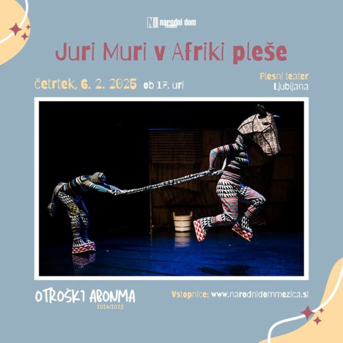 V četrtek, 6. 2. 2025, ob 17. uri bo na sporedu četrta otroška abonmajska plesno glasbeno gledališka predstava JURI MURI V AFRIKI PLEŠE v izvedbi Plesnega teatra Ljubljana.
