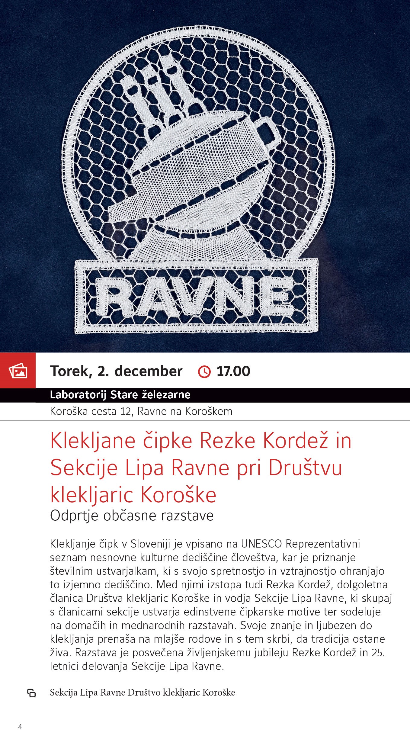 Sekcija Lipa Ravne Društvo klekljaric Koroške in Koroški pokrajinski muzej, Muzej Ravne na Koroškem vas v torek, 2. decembra 2025, ob 17. uri vabita v Laboratorij Stare železarne, Koroška cesta 12, Ravne na Koroškem na odprtje občasne razstave Klekljane čipke Rezke Kordež in Sekcije Lipa Ravne pri Društvu klekljaric Koroške.