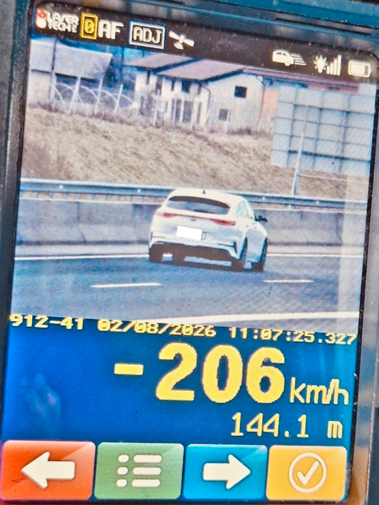 Policisti Postaje prometne policije Celje so v nedeljo na avtocesti A1 izvajali poostren nadzor cestnega prometa, usmerjen v ugotavljanje prekoračitev hitrosti. Med nadzorom so zaznali več kršitev voznikov osebnih vozil, pri čemer posebej iztopa primer voznika, ki je na odseku avtoceste A1 izven naselja Šentrupert, kjer je hitrost omejena na 130 km/h, vozil s hitrostjo kar 206 km/h.