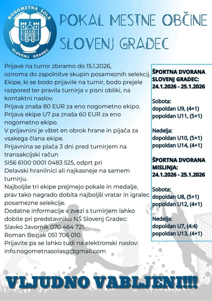 Tudi to zimo bo Mestna občina Slovenj Gradec gostila največji zimski nogometni dogodek za mlade nogometaše v regiji – tradicionalni Turnir za pokal Mestne občine Slovenj Gradec, ki ga organizira Nogometna šola Slovenj Gradec. Dogodek bo potekal 24. in 25. januarja 2026 v športnih dvoranah Slovenj Gradec in Mislinja.