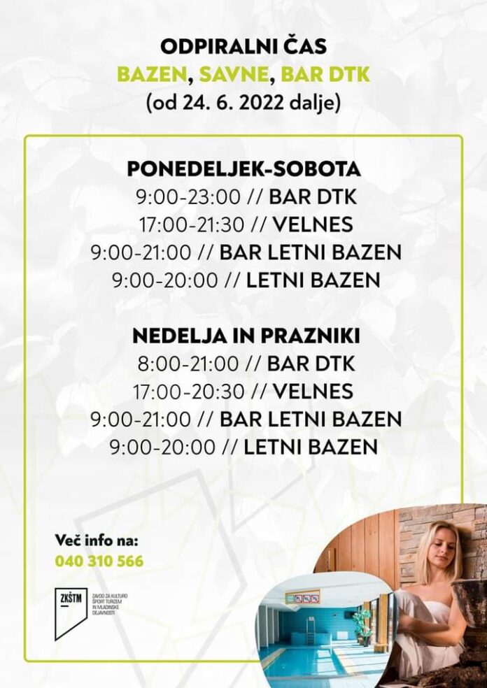 Na ZKŠTM Ravne so objavili nov odpiralni čas Bara DTK, Velnesa, Bara Letni bazen in Letnega bazena. V času počitnic je letni bazen odprt od 9h do 20h.