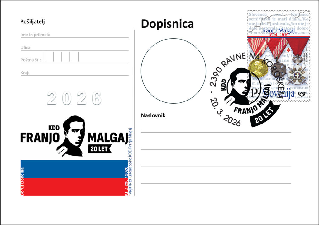 V počastitev obletnice pa bo sodelovanju z Koroškim filatelističnimi društvom izdan tudi priložnostni poštni žig, ki bo v uporabi, poleg rednih poštnih žigov, v petek, 20. marca 2026,  na pošti 2390 Ravne na Koroškem. Poleg žiga bosta izdana tudi ilustrirana dopisnica (KFD 298/2026), ki bo uporabljena tudi kot uradno vabilo na predstavitev zbornika ter priložnostna poštna ovojnica/kuverta (KFD 298/2026).