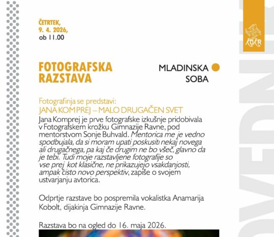 Koroška osrednja knjižnica dr. Franca Sušnika Ravne na Koroškem vas v četrtek, 9.4.2026, vabi na odprtje fotografske razstave Jane Komprej-Malo drugačen svet. Dogodek se...