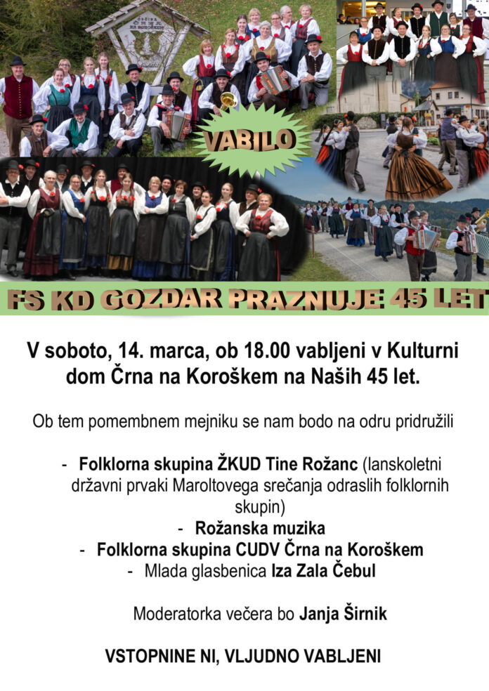 Folklorna skupina Kulturnega društva Gozdar Črna na Koroškem letos obeležuje 45 let uspešnega delovanja in predanega ohranjanja folklorne dediščine. Ob tej pomembni obletnici bo v soboto, 14. marca, ob 18.00 v Kulturnem domu Črna na Koroškem potekala slavnostna prireditev s pestrim kulturnim programom in podelitvijo Marlotovih značk. Obiskovalci boste lahko uživali v glasbi, plesu ter utrinkih iz bogate zgodovine skupine, ki že skoraj pol stoletja soustvarja kulturno življenje v kraju in širši okolici. Dogodek bo priložnost za obujanje spominov, zahvalo vsem nekdanjim in sedanjim članom ter skupno praznovanje častitljivega jubileja.
