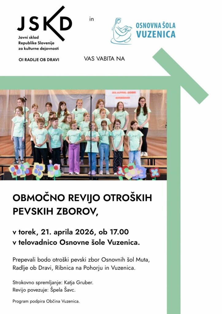 V torek, 21. 4., ob 17. uri pa bo potekala Območna revija otroških pevskih zborov. V telovadnici Osnovne šole Vuzenica bodo zbori osnovnih šol Muta, Radlje ob Dravi, Ribnica na Pohorju in Vuzenica. Srečanje bo strokovno spremljala Katja Gruber.