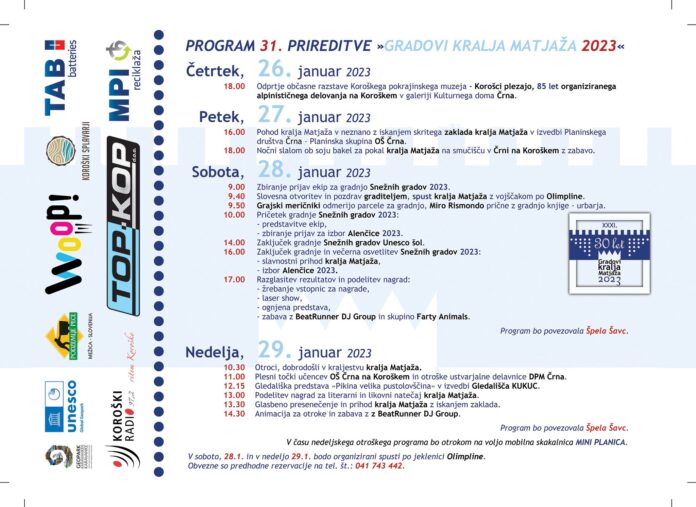 Ta konec tedna bodo na Matevžavih travnikih v Črni na Koroškem potekali 31. Gradovi kralja Matjaža. Kralj Matjaž se je odločil, da bo najboljšemu gradu po izboru občinstva podaril kar 1000 eur nagrade. Pričetek gradnje gradov bo v soboto, 28.1.2023 ob 10.uri, ob 9.uri bo zbiranje prijav. Organizatorji pa so, poleg same glavne prireditve, pripravili tudi bogat spremljevalni program.